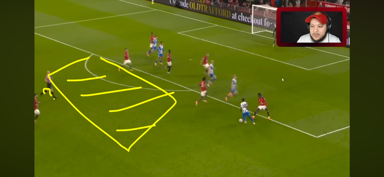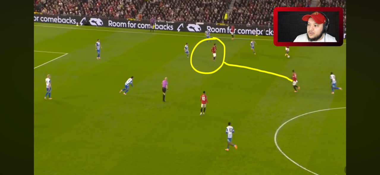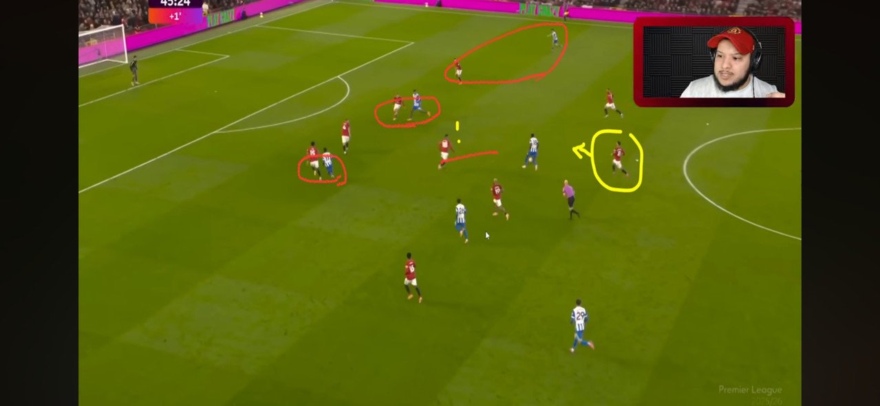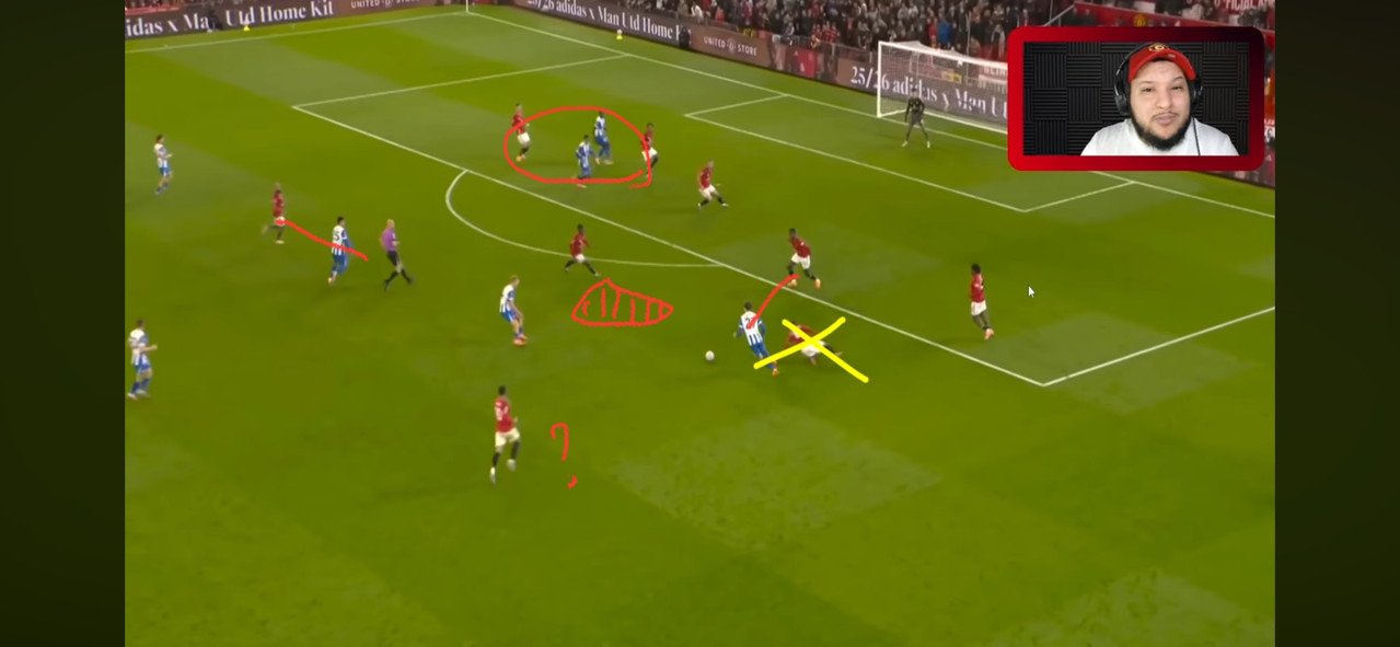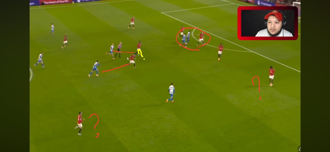 Mais même pas, même là on est en place et en surnombre. Ça devrait être facile pour Heaven de monter sur le porteur surtout que Dorgu peut le couvrir en allant dans l’axe. Mainoo est bien placé pour prendre le joueur libre dans l’axe ou pour fermer sur le porteur s’il va vers l’axe.